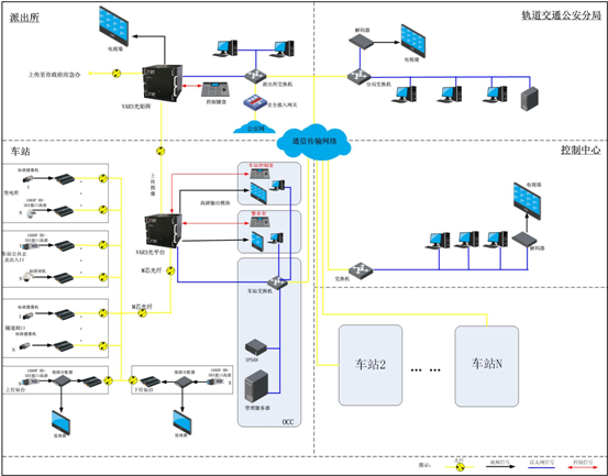 本系统由车站警务室、派出所、地铁公安分局三部分组成,实现对沿线各车站出入口、过街通道、站台和站厅等处的治安状况的监视,列车车厢中的监控地铁已经在建设中实施,要求接入实时视频图象,共享该资源。警务站所辖图像通过1芯光纤上传至派出所,并在派出所进行存储;派出所接受警务站的图像,同时也通过1芯光纤上传至地铁分公安局;地铁分公安局通过公安专网将图像上传至市局。